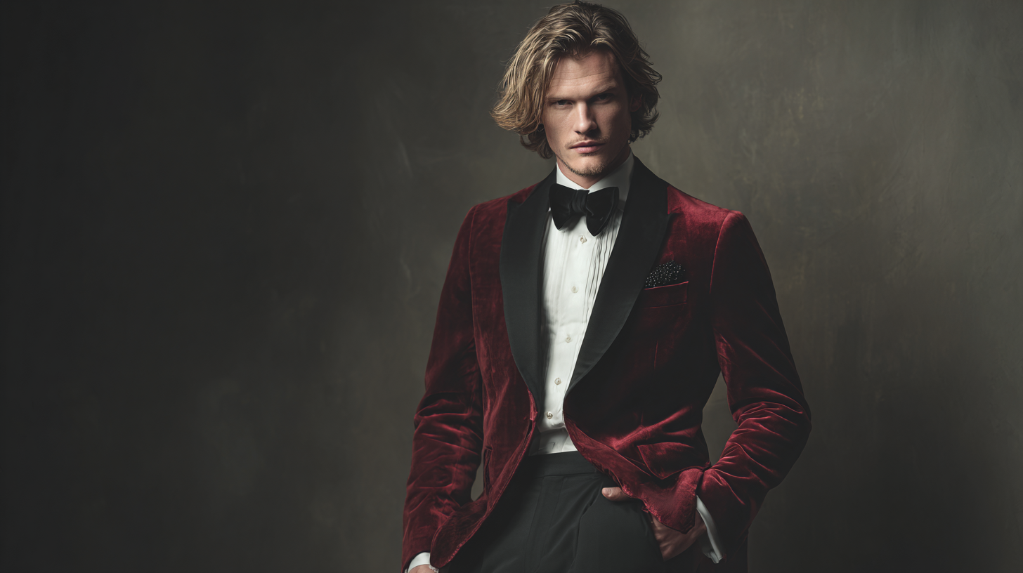 Colour plays subtly in the light (e.g., deep burgundy shifting to wine), while satin lapels add crisp contrast.